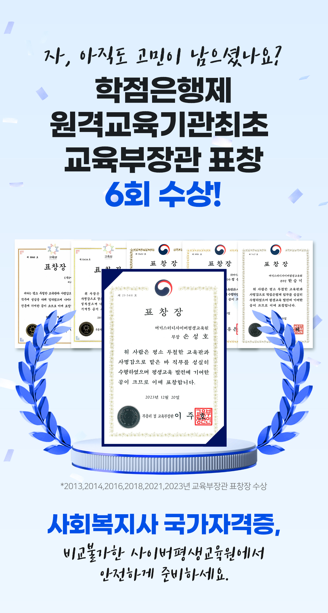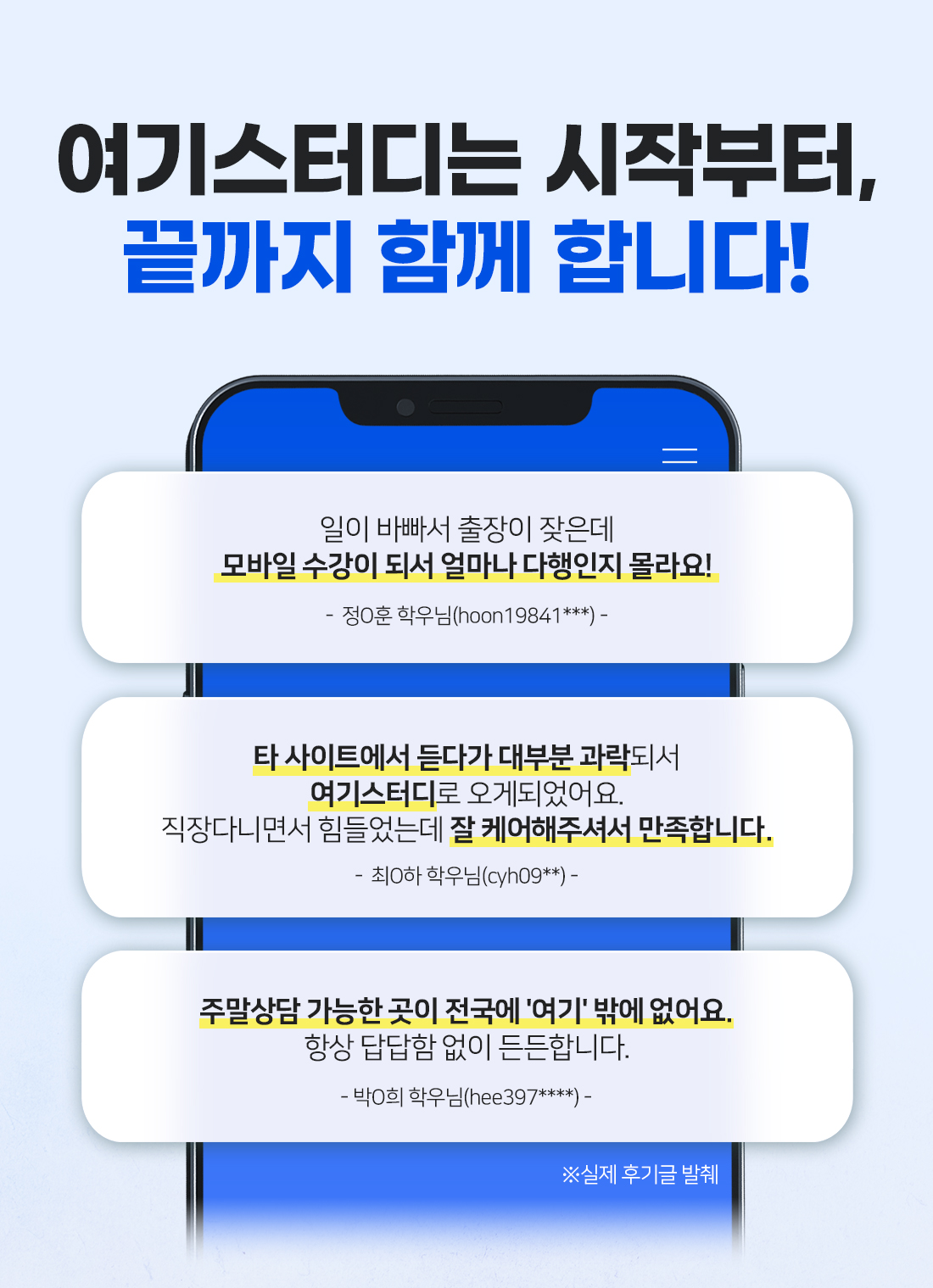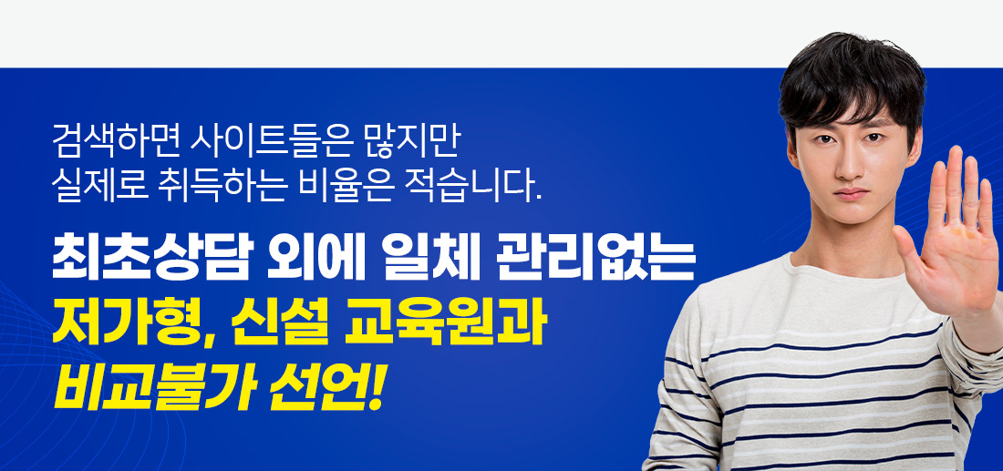 여기스터디사이버평생교육원은 수강신청, 상담 및 할인혜택, 경품제공등의 서비스 이용을 위해 필요한 최소한의 개인정보만을 수집합니다. 귀하가 여기스터디사이버평생교육원의 서비스를 이용하기 위해서는 상담신청시(이름, 연락처) / 수강신청시(이름, 연락처, 결제정보, 주민등록번호)를 필수적으로 입력하셔야 합니다.
