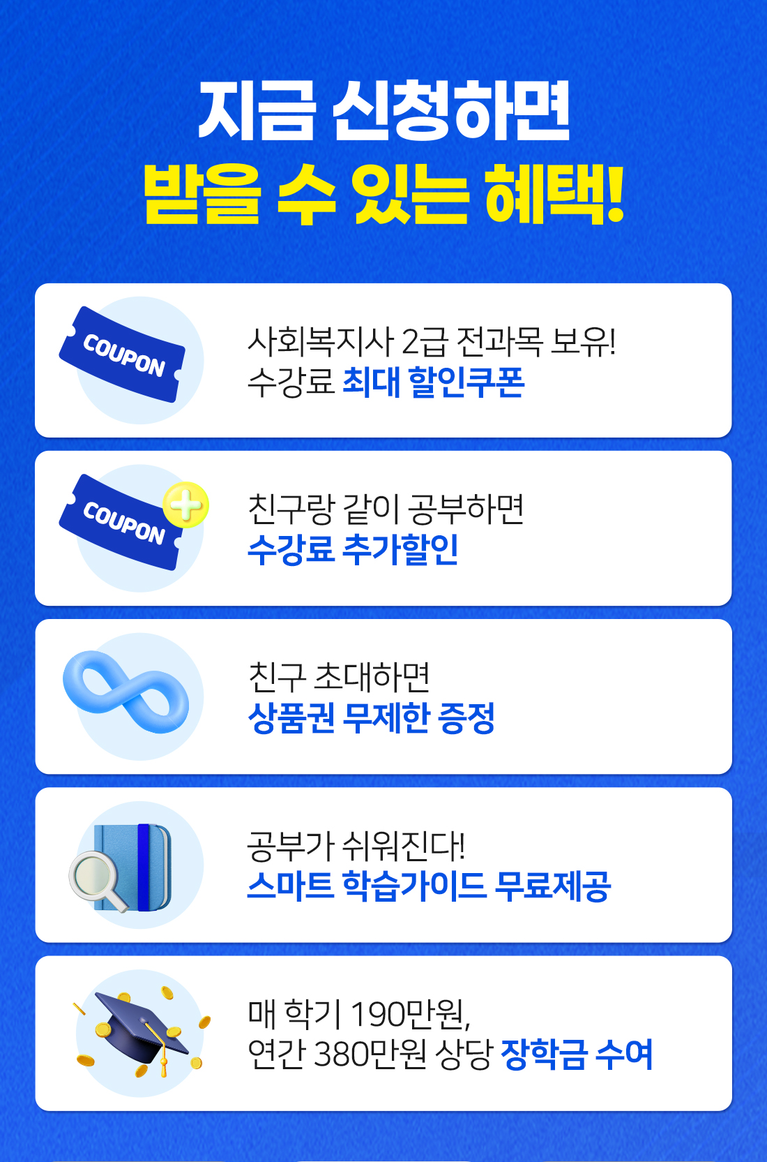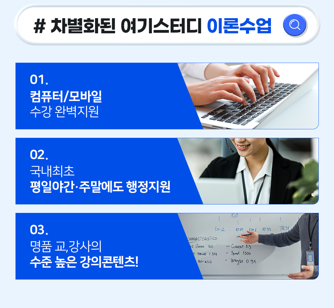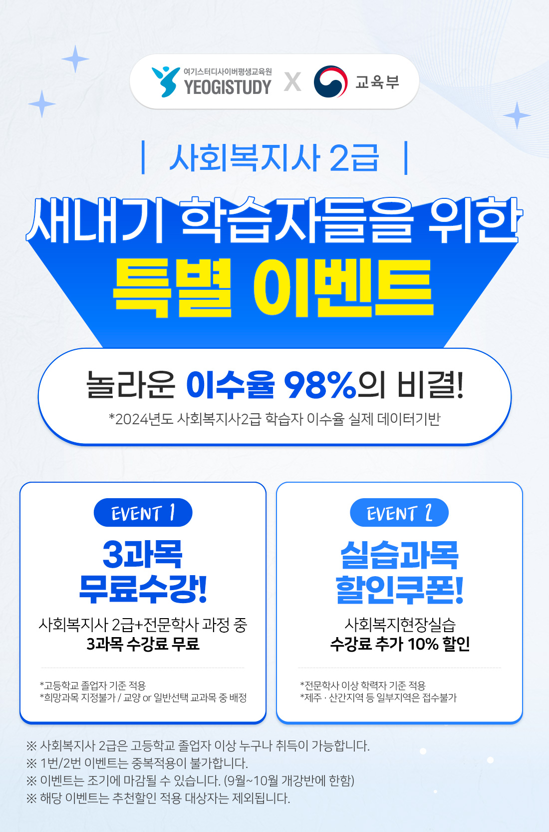 여기스터디사이버평생교육원은 수강신청, 상담 및 할인혜택, 경품제공등의 서비스 이용을 위해 필요한 최소한의 개인정보만을 수집합니다. 귀하가 여기스터디사이버평생교육원의 서비스를 이용하기 위해서는 상담신청시(이름, 연락처) / 수강신청시(이름, 연락처, 결제정보, 주민등록번호)를 필수적으로 입력하셔야 합니다.