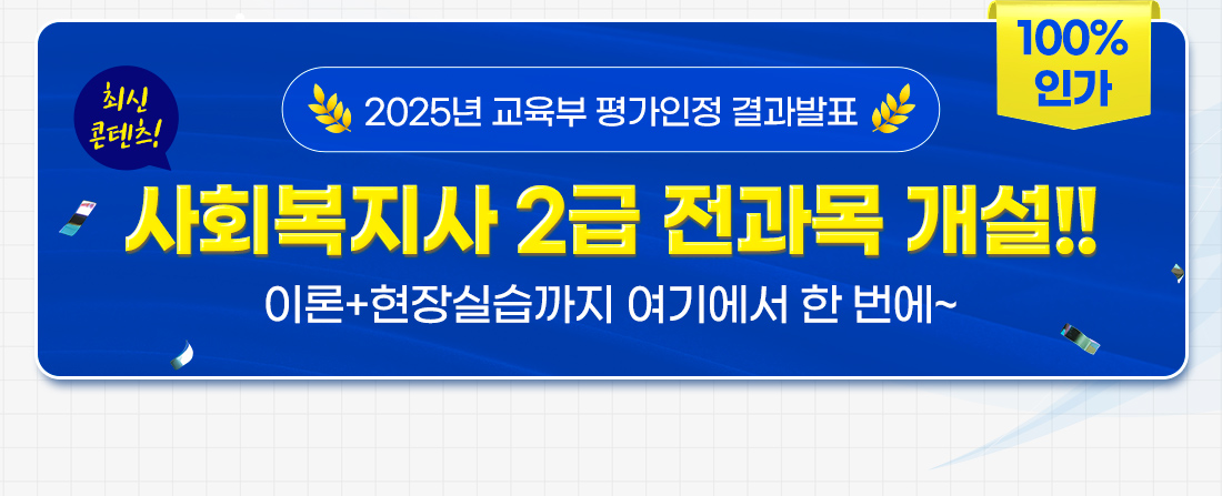 사회복지사 2급 전과목 보유! 수강료 최대 할인쿠폰 친구랑 같이 공부하면 수강료 추가할인 친구 초대하면 상품권 무제한 증정 과락없이 100% 한 번에 취득하는 비법서 무료증정 매 학기 190만원 연간 380만원 상당 장학금 수여