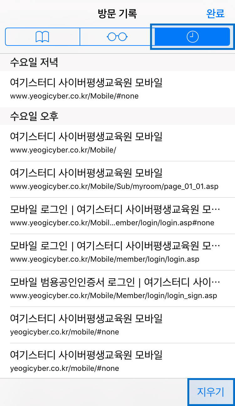 STEP 02. 방문기록 세 번째 탭 하단 [지우기] 클릭